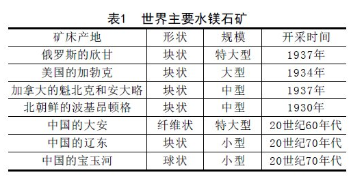 水鎂石礦床在世界范圍內(nèi)分布不廣,而且礦床規(guī)模一般較小,主要集中在俄羅斯、美國、加拿大、朝鮮、挪威等。國內(nèi)外主要的水鎂石礦床情況見表1。