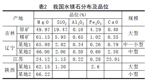 目前為止,我國已探明的水鎂石資源總儲(chǔ)量已超過2500萬t,屬中等儲(chǔ)量規(guī)模,其礦床分布及品位見表2。