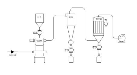 原理:壓縮氣體通過拉瓦爾噴嘴加速成超音速氣流射入粉碎室,粉碎室中的物料被超音速氣流加速成流態(tài)化,互相碰撞,互相破碎,從而實(shí)現(xiàn)對(duì)物料的超細(xì)粉碎。粉碎后的物料被上升氣流送至分級(jí)區(qū),由分級(jí)輪分選出符合粒度要求的細(xì)粉。未被分選出的粗粉,會(huì)返回對(duì)撞粉碎區(qū)繼續(xù)粉碎,一直粉碎到所需要的細(xì)度,最終被分級(jí)輪分選出去。攜帶成品粉料的氣流進(jìn)入旋風(fēng)分離器進(jìn)行分離,絕大部分的成品粉料經(jīng)旋風(fēng)分離器分離后,由排料裝置排出。其余過細(xì)粉料和氣體進(jìn)入脈沖清灰收塵器,被脈沖清灰收塵器收集下來。凈化的氣體經(jīng)引風(fēng)機(jī)排出機(jī)外。